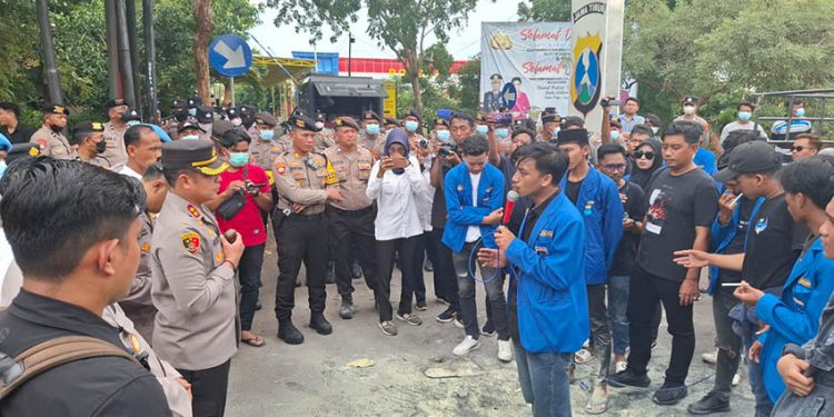 Ketegangan sempat terjadi antara demonstran dan aparat kepolisian. Saling dorong antara kedua pihak tak terhindarkan, namun aksi tetap berjalan hingga tuntutan mahasiswa disampaikan.