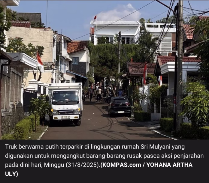 JAKARTA, CNI – Dua truk berwarna putih keluar dari lingkungan rumah Menteri Keuangan Sri Mulyani yang berada di Jalan Mandar X, Bintaro Sektor 3A, Tangerang Selatan. Kedua truk mengangkut barang-barang sisa jarahan. Diketahui, rumah Sri Mulyani menjadi salah satu yang mengalami penjarahan pada Minggu (31/8/2025) dini hari.