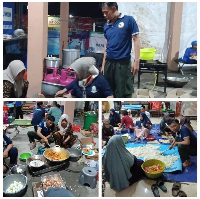 Para Pendamping Sosial, termasuk Tagana, Tim SLRT Sejahtera, TKSK, dan PKH, kru Dinsos dan dukungan dari berbagai elemen masyarakat, turut serta dalam penyediaan makanan.