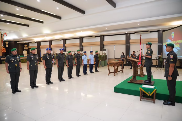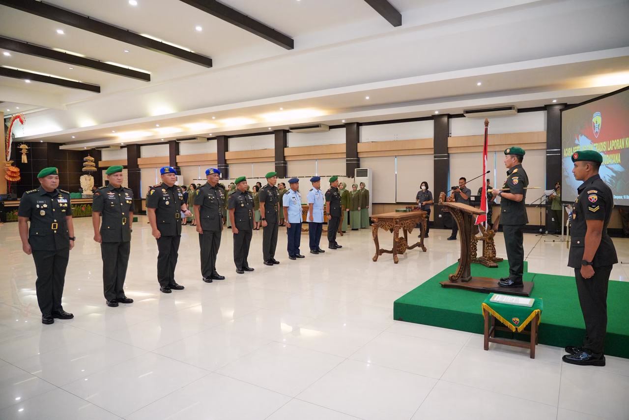 Denpasar — Panglima Komando Daerah Militer (Pangdam) IX/Udayana, Mayjen TNI Piek Budyakto, memimpin acara serah terima jabatan (Sertijab) dan tradisi laporan korps pejabat Kodam IX/Udayana yang berlangsung di Aula Supardi, Makodam IX/Udayana, Jl. Udayana No.1 Denpasar, Kamis (16/10/2025).