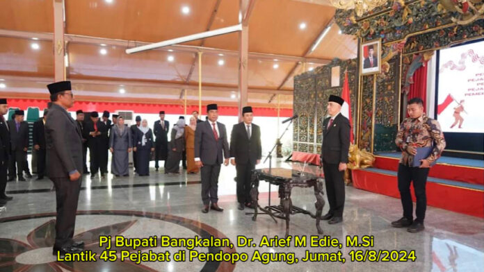 BANGKALAN, CNI (CendanaNewsIndonesia.com) – Pj Bupati Bangkalan Dr. Arief M. Edie, M.Si melakukan penyegaran birokrasi dengan melakukan mutasi dan pelantikan pejabat di lingkungan Pemerintah Kabupaten (Pemkab) Bangkalan pada Jumat (16/8/2024) di Pendopo Agung Bangkalan.