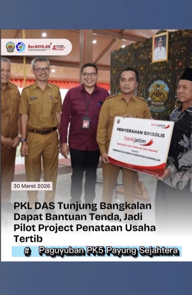Bantuan sementara masih sebanyak 22 dari 32 unit tenda yang dimohon oleh PKL “Payung Sejahtera Bangkalan ini diserahkan langsung secara simbolis oleh Bupati Bangkalan, Lukman Hakim, di Pendopo Agung Bangkalan. Program tersebut merupakan hasil kolaborasi melalui Corporate Social Responsibility (CSR) dari Bank Jatim, BPR Jatim, serta PT Sumber Daya Perseroda Bangkalan.