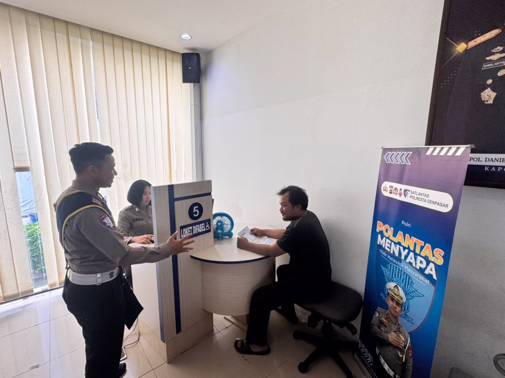 Terlihat seorang personel Polantas memberikan pendampingan langsung kepada pemohon SIM yang tengah mengikuti proses pelayanan di loket Satpas Polresta Denpasar. Pendampingan ini dilakukan untuk memastikan bahwa setiap pemohon memahami alur pelayanan, tata cara pengisian data, serta mendapatkan informasi yang jelas terkait persyaratan dan tahapan yang harus dilalui.