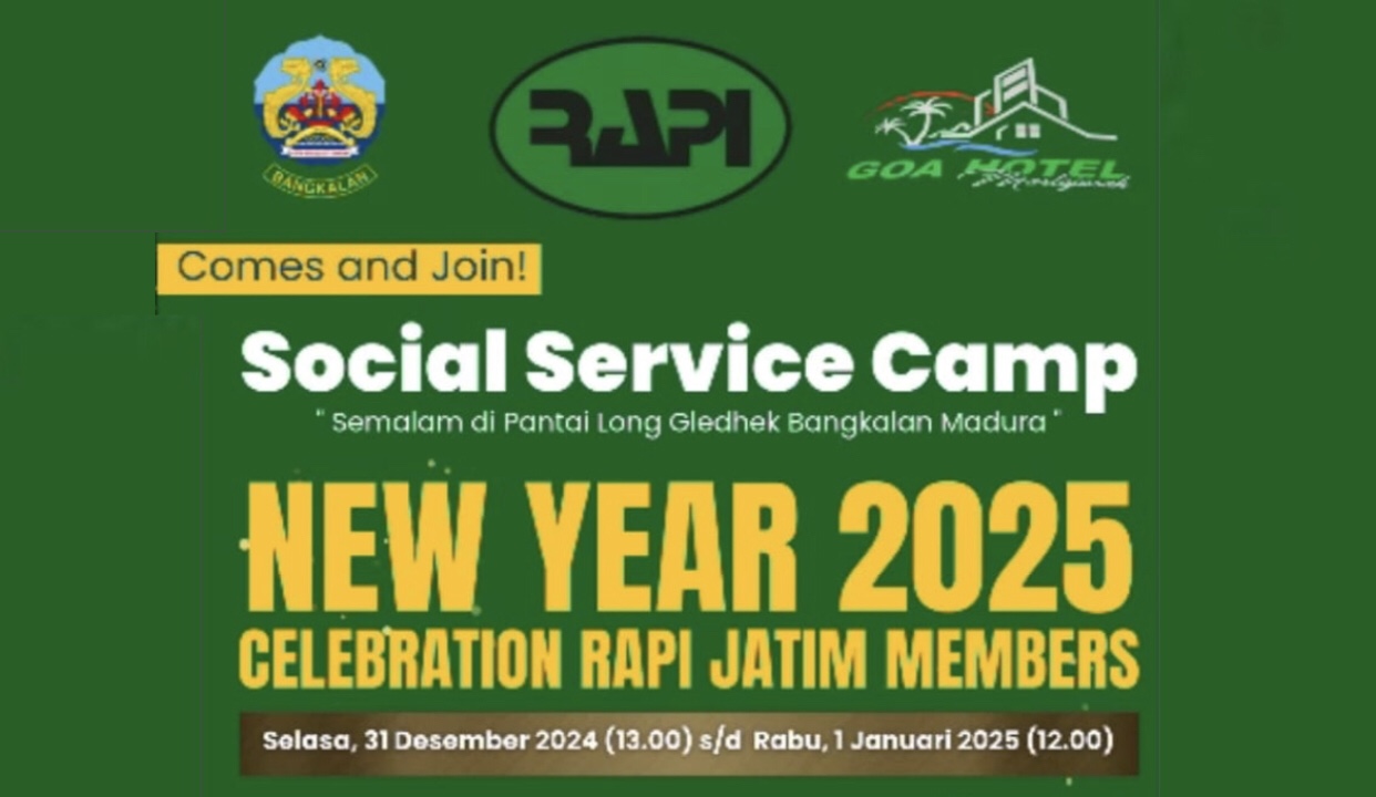 Dalam rangka menyambut malam tahun baru 2025, Radio Antar Penduduk Indonesia (RAPI) Kabupaten Bangkalan akan mengelar kegiatan “Social Service Camp” bertempat di Goa Hotel Long Gledhek, Martajasah Kabupaten Bangkalan, pada tanggal 31 Desember 2024 sampai tanggal 1 Januari 2025.