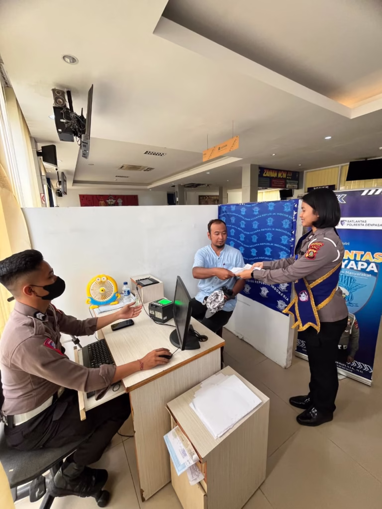 Denpasar – Satuan Lalu Lintas (Satlantas) Polresta Denpasar melaksanakan kegiatan “Polantas Menyapa” sebagai bentuk inovasi pelayanan publik Polri yang hadir lebih dekat dengan masyarakat. Kegiatan ini berlangsung di ruang pelayanan Satlantas Polresta Denpasar dan diikuti oleh masyarakat yang tengah melakukan pengurusan administrasi di bidang lalu lintas.